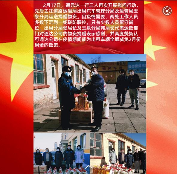 在新型冠狀病毒肺炎疫情肆虐神州大地之時(shí),在這個(gè)特殊的時(shí)期里,每個(gè)人都卷入了一場(chǎng)特殊的戰(zhàn)役。在疫情當(dāng)前我們看到一批批勇敢的逆行者夜以繼日的堅(jiān)守在一線崗位,保障著你我健康安全,守護(hù)者大家的生活秩序。內(nèi)蒙古通達(dá)實(shí)業(yè)股份有限公司強(qiáng)化責(zé)任擔(dān)當(dāng)、積極響應(yīng)、迅速行動(dòng),在做好各項(xiàng)防控措施的同時(shí)出資20萬元善款,通過全市多個(gè)轄區(qū)內(nèi)的街道辦事處進(jìn)行愛心物資捐贈(zèng)活動(dòng),以表達(dá)通達(dá)公司對(duì)奮戰(zhàn)在疫情聯(lián)防聯(lián)控一線的工作人員最崇高的敬意!