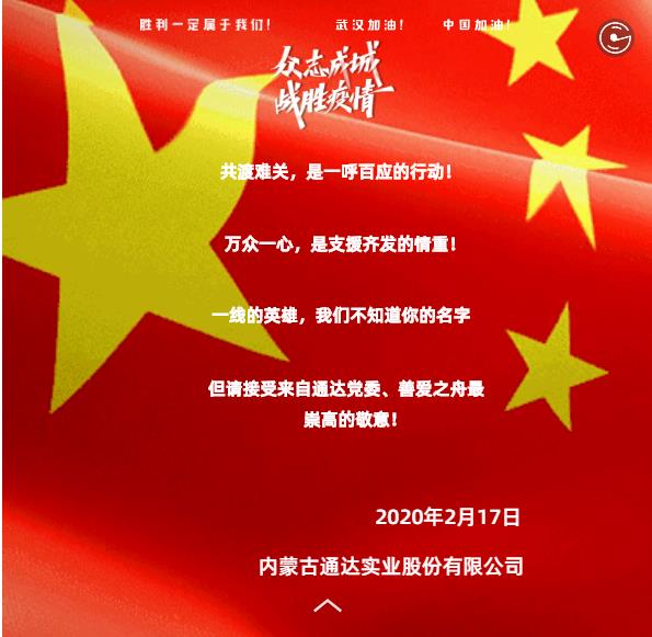 內(nèi)蒙古通達(dá)實(shí)業(yè)股份有限公司在此次新型冠狀病毒肺炎疫情期間共對(duì)接7個(gè)政府部門進(jìn)行愛心物資專項(xiàng)捐贈(zèng)活動(dòng),為在防控疫情一線的志愿者們累計(jì)捐贈(zèng)20萬元。