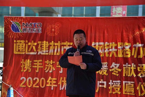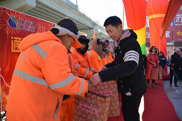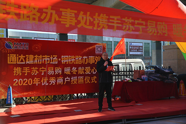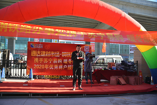2020年11月29日舉行了通達(dá)建材市場(chǎng)2020年暖冬活動(dòng)以及優(yōu)秀商戶授匾儀式。整體活動(dòng)分為三部分,1.由市場(chǎng)主導(dǎo)定制沖鋒衣,蘇寧易購(gòu)出資,共同為市場(chǎng)以及周邊裝卸工提供暖冬定制沖鋒衣。2.聯(lián)合鋼鐵路辦事處,召集周邊環(huán)衛(wèi)工人,發(fā)放采購(gòu)好的保暖 慰問品和定制水杯。3.公布優(yōu)秀商戶名單,并進(jìn)行授匾儀式。王總在活動(dòng)當(dāng)中講到“我們要共同努力克服每一個(gè)困難,只要路的對(duì)的,就不怕路遠(yuǎn)”樹立了商戶對(duì)未來的信心。整體過程由首府直通車全程參與,活動(dòng)期間鋼鐵路辦事處領(lǐng)導(dǎo)的講 話也是非常認(rèn)可我們建材市場(chǎng)的工作。