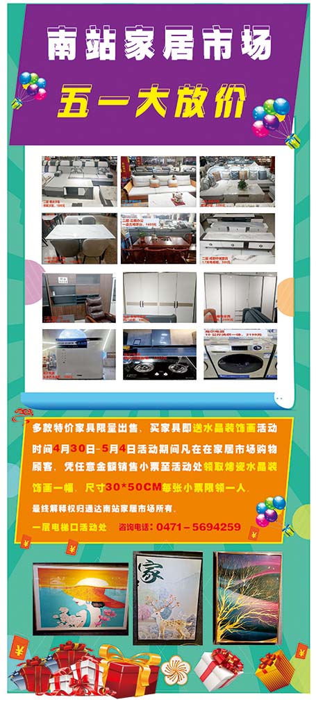 家居市場(chǎng)"五一大放價(jià)"營銷活動(dòng),配合節(jié)日活動(dòng)營造節(jié)日氛圍,場(chǎng)外空飄條幅布置,家居市場(chǎng)戶外樹立了6顆空飄氣球,渲染了節(jié)日氣氛,廣而告之的宣傳手段,一定程度上提升了市場(chǎng)活動(dòng)的社知曉度! 會(huì) 場(chǎng)內(nèi)買贈(zèng)有禮活動(dòng)火熱進(jìn)行中。
