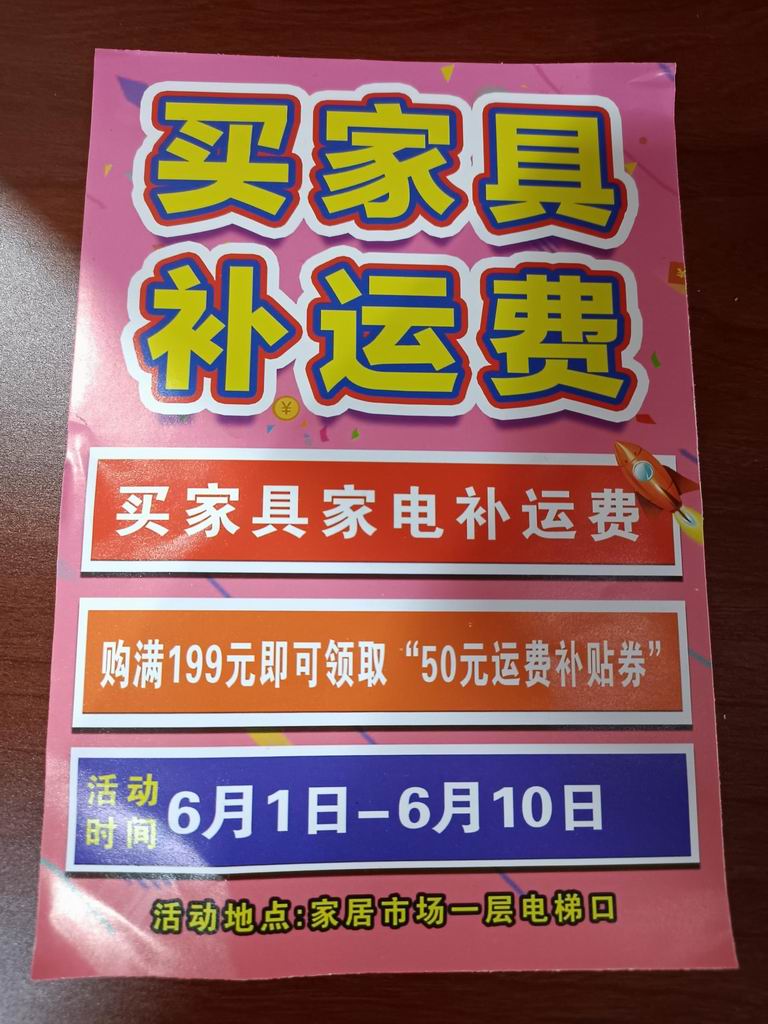 南站家居市場端午節(jié)促銷活動(dòng),從6日1日至10日,本著回饋消費(fèi)者,提升商戶銷售量,烘托購物氣氛,買家具補(bǔ)運(yùn)費(fèi),來吸引消費(fèi)者,家具市場從6月11日開始至13日,進(jìn)行補(bǔ)運(yùn)費(fèi)領(lǐng)現(xiàn)金活動(dòng),商戶,消費(fèi)者對本次促銷形式滿意,本次活動(dòng)即增加了商戶銷售額,又提升了市場知名度。
